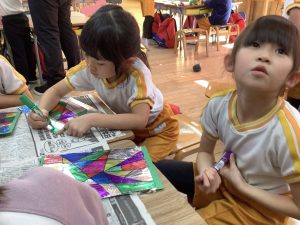 今月はクリスマスツリーをテーマに壁面制作を作りました🎄画用紙にアルミホイルを貼り、そこに線を引いて中を塗り、ステンドグラス風に仕上げましたよ♪それらをツリーの形に自分たちで切ったり、画用紙にサンタさんにお願いするプレゼントを描いてクリスマスらしく仕上がりました⭐