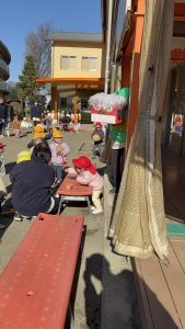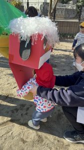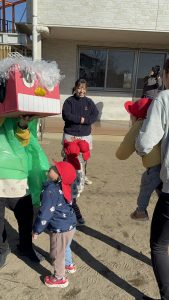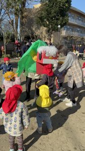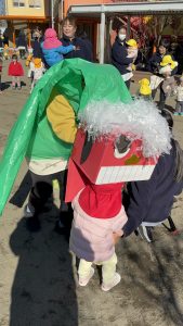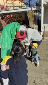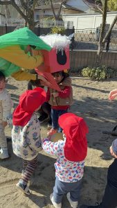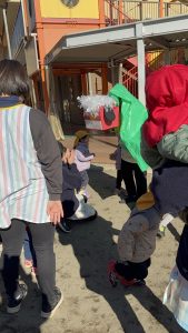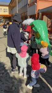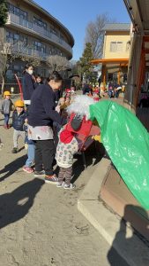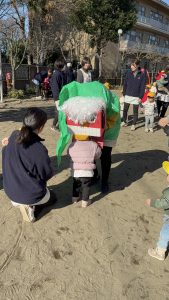 お正月集会で、「獅子舞は悪いものを追い払う縁起の良いものなんだよ」と聞いていた子ども達。
