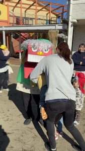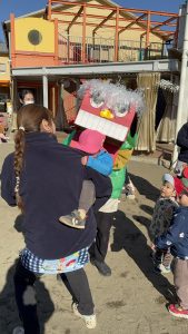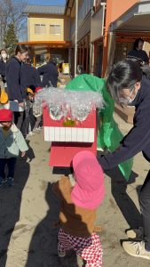 「頭をガブッと噛まれると頭がよくなる」と教えてもらって、みんなで獅子舞のお口に頭を入れに行きます😊