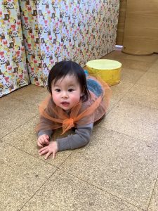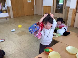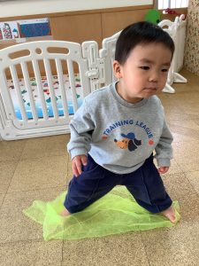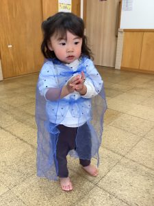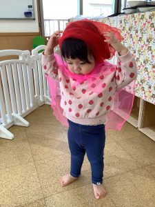 スカーフ遊びも楽しんでいましたよ。まるでお姫様や赤ずきんちゃんのようで可愛らしかったです。