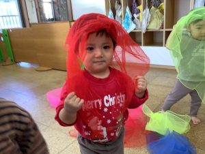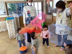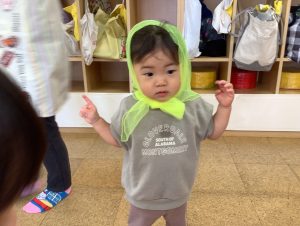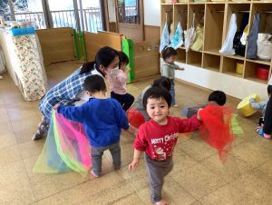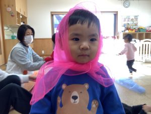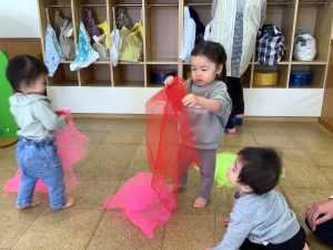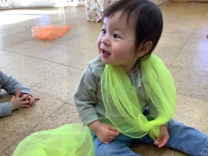 こんにちは!つぼみ組の宮下です。先日はじめてスカーフで遊びました。
