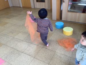 ふわふわの布をかぶったり、透かしてみたり楽しんでいましたよ。