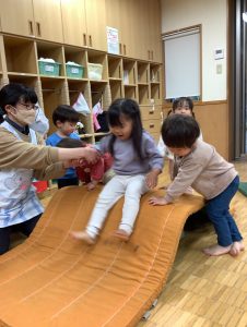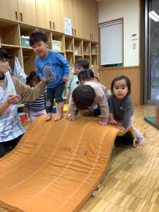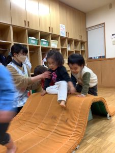 次はマットの滑り台🎈よじ登ってジャンプ!