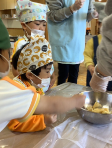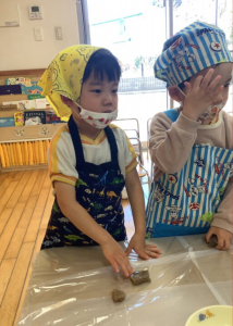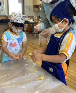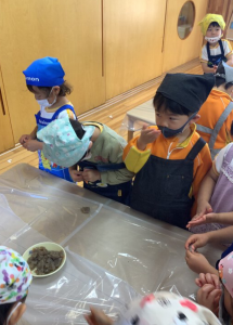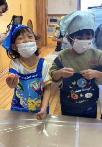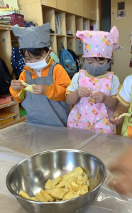 わかば組は、油揚げとこんにゃくをちぎりました。