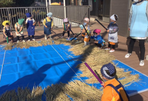 その後は、2階のテラスお米の脱穀を体験❗❗