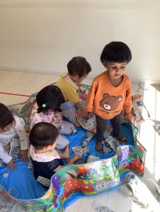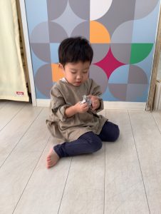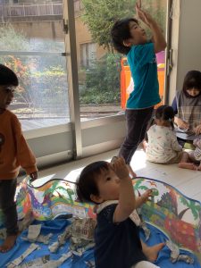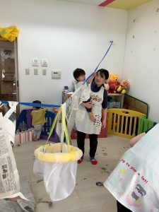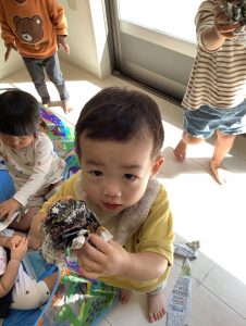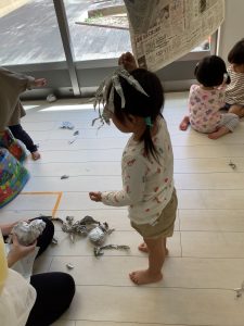 大きなボールを作りたくて、「テープで留めて~🤩」とおねだりするお友達も🎶
