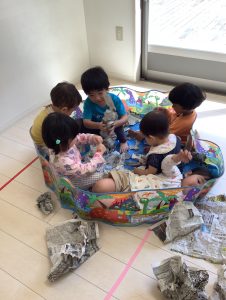 ビニールプールに新聞紙を少し千切って入れてあげると、みんなもビリビリ、クシャクシャとします🎶